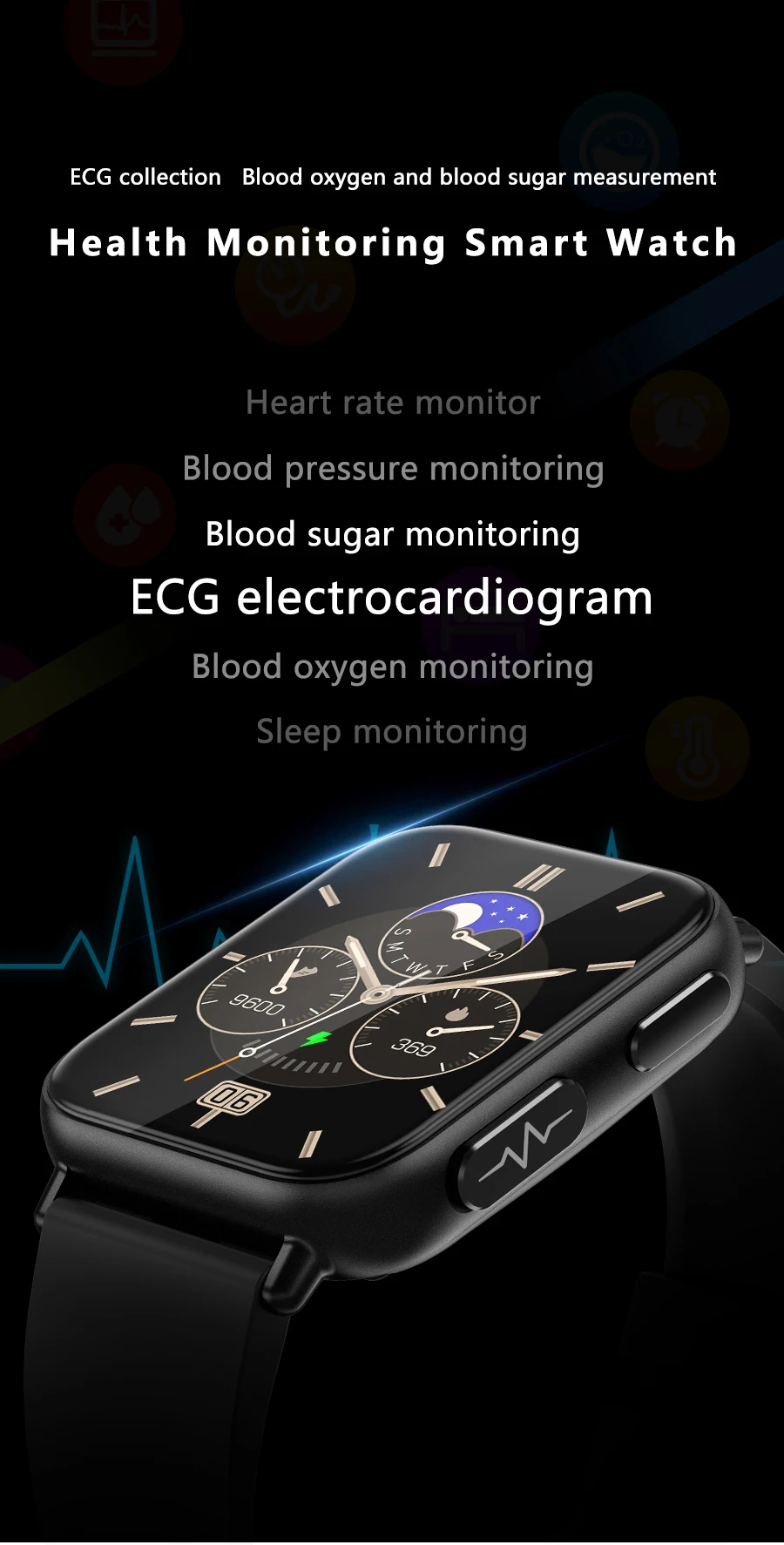 - Painless Monitoring: Say goodbye to the discomfort of traditional methods. The watch measures blood glucose levels seamlessly. without the need for any needle pricks.