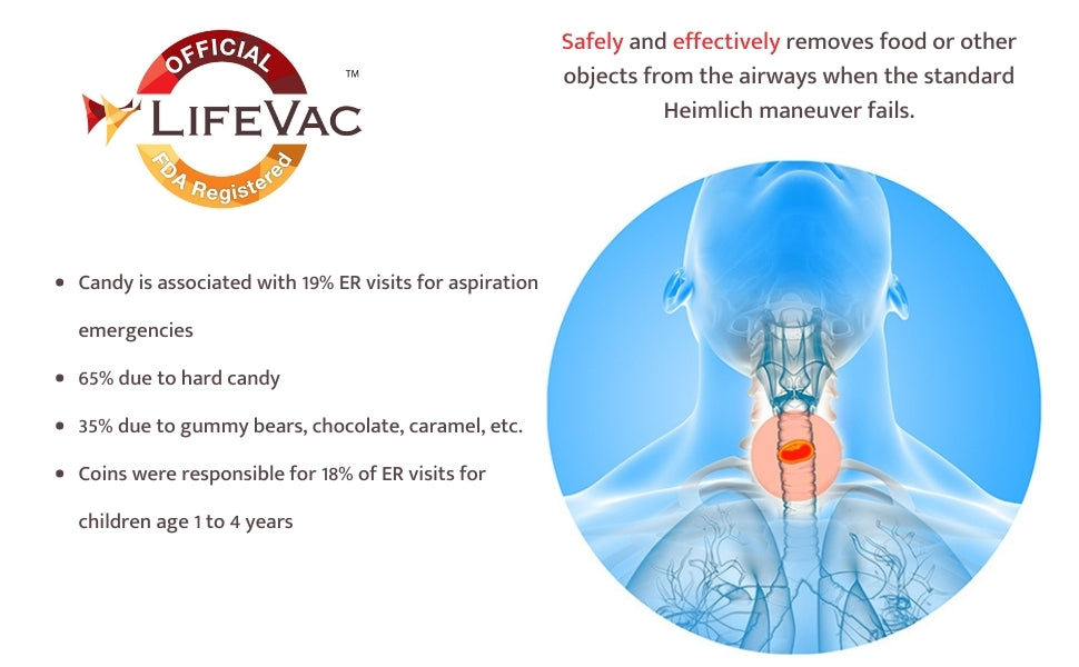 LifeVac is a non-powered, non-invasive, single-use airway clearance device designed to resuscitate a victim with an airway obstruction when traditional choking protocols have failed. It features a one-way valve that prevents air from entering the choking victim on the downward motion. The suction duration is minimal, making LifeVac both safe and effective. LifeVac is easy to use during an obstructed airway emergency.