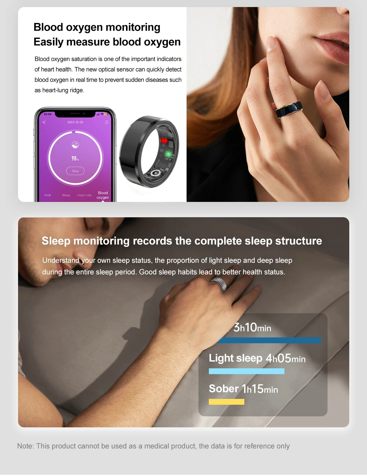 NIGHT SLEEP TRACKER:The smart ring includes a night sleep tracking feature that helps you monitor your sleep patterns .It tracks your sleep stages including deep sleep, light sleep and awake. This sleep tracker ring is a health ring that gives you a comprehensive view of your night time rest.