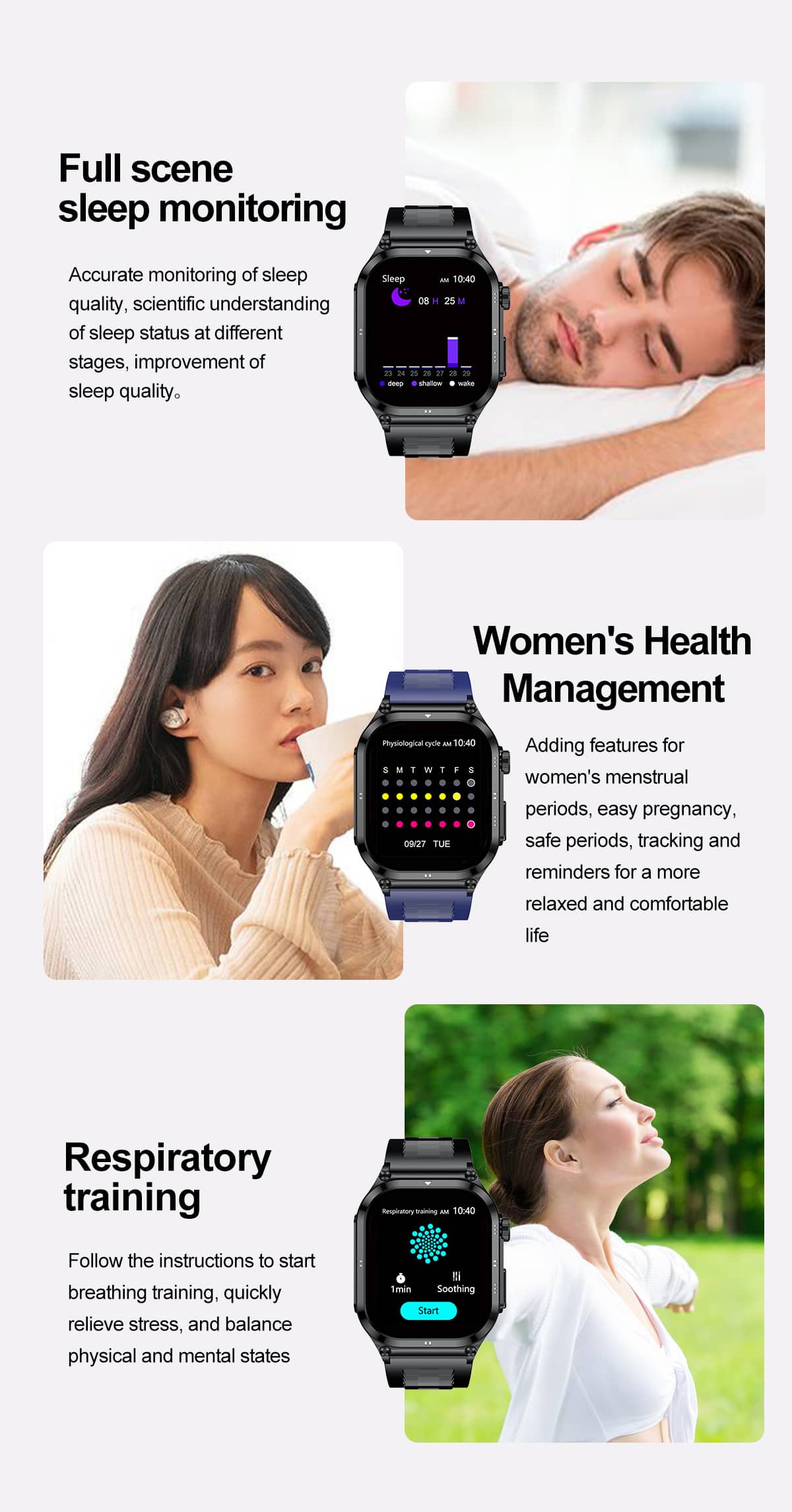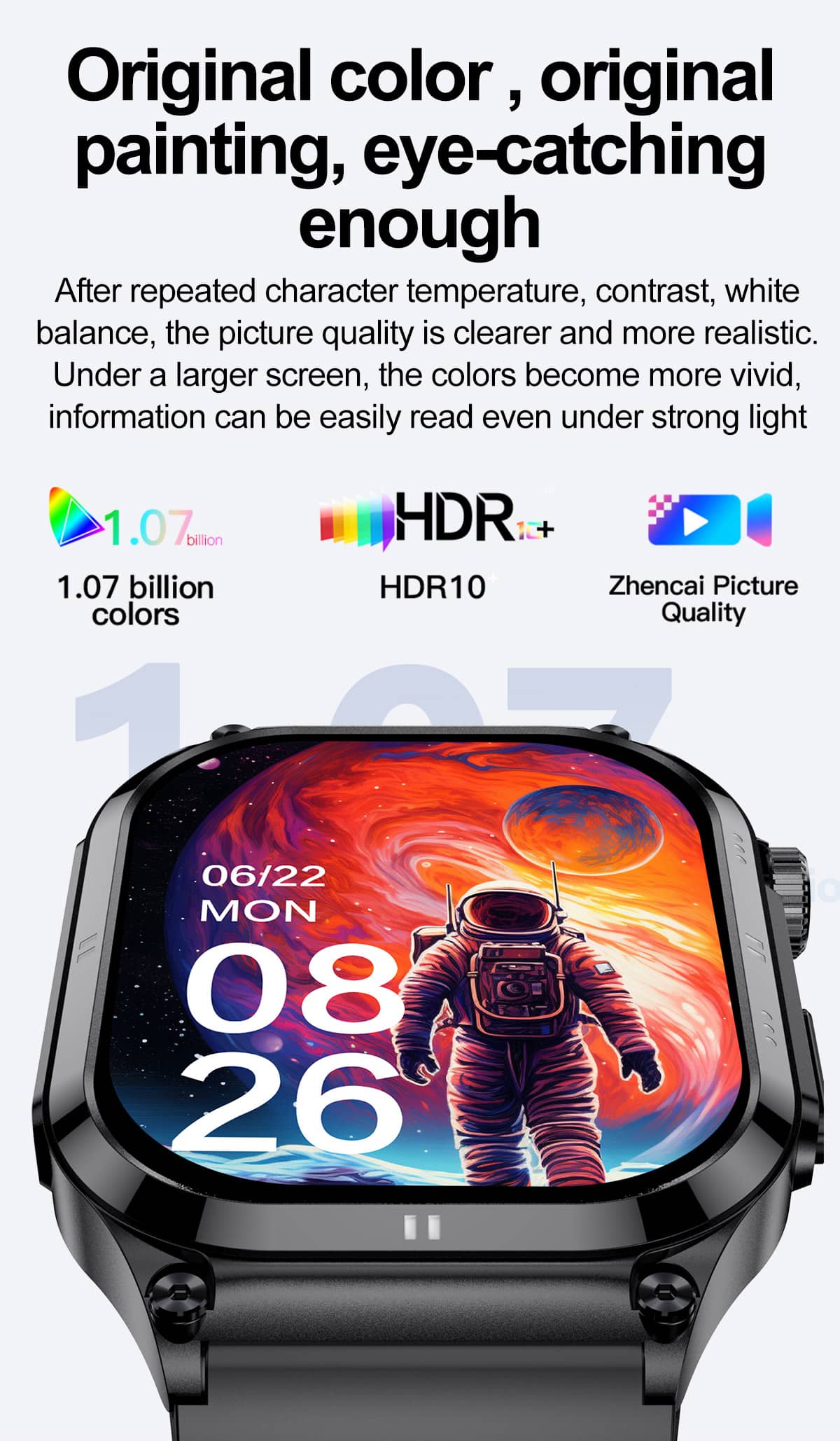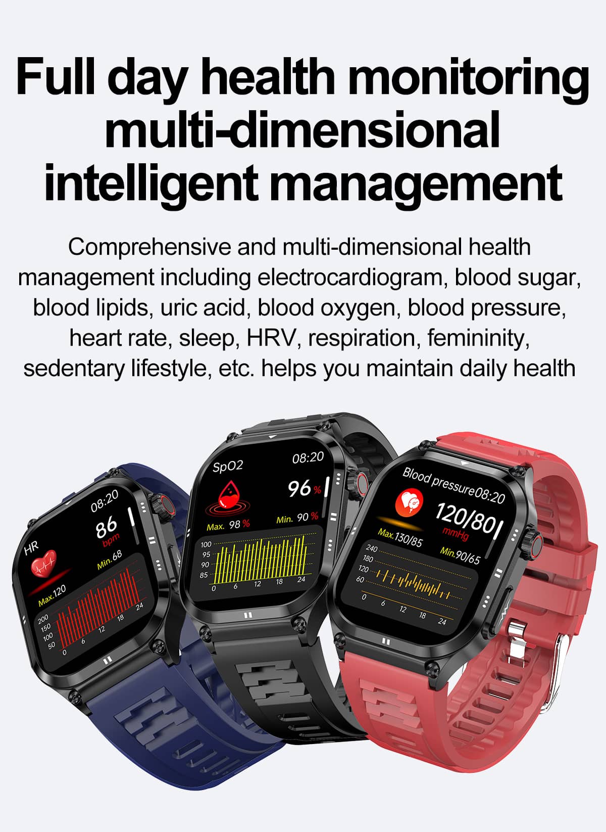 24/7 Continuous Heart Rate Monitoring to keep track of your heart activity throughout the day and night.Bluetooth call,give your life more freedom.Full day health monitoring muiti-dimensional intelligent management