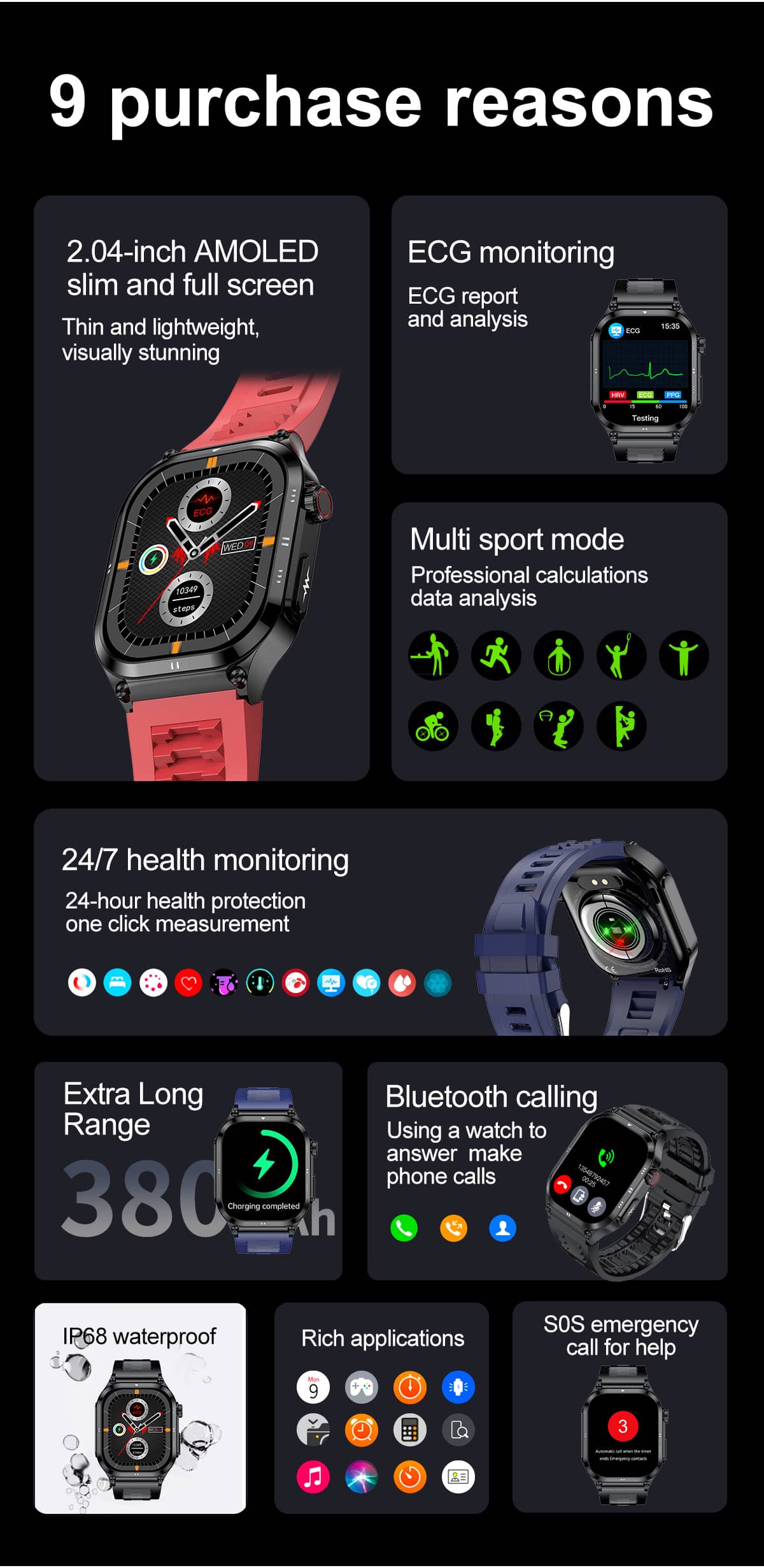 Syncs seamlessly with both IOS and Android - no matter what phone you use, we got you covered.2.04 "AMOLED Colorfuarge Screen,IP68 waterproof,Bluetooth voice calls,phone calls, watch answers.