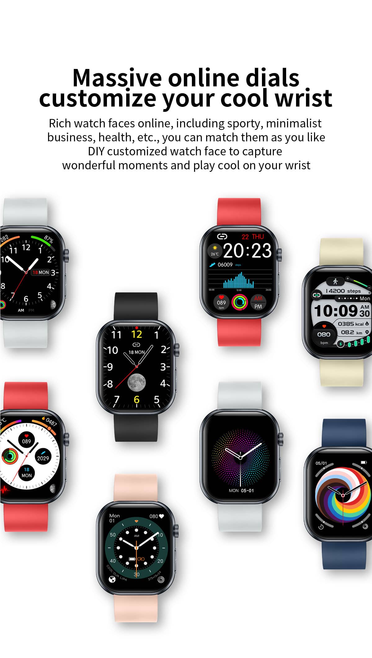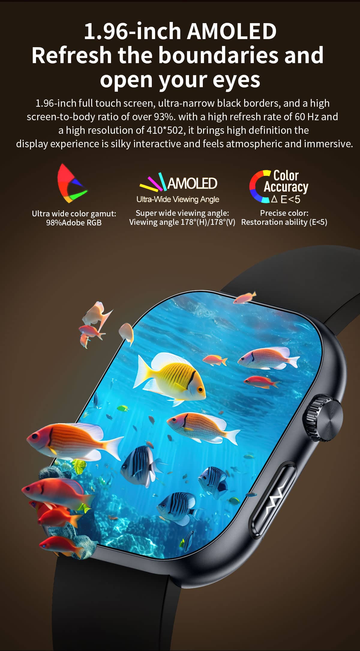 Syncs seamlessly with both IOS and Android - no matter what phone you use, we got you covered. 1.96 "AMOLED Colorfuarge Screen, IP68 waterproof. NFC
