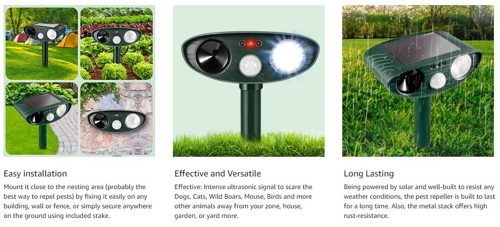 Detects motion and triggers the ultrasonic speaker to produce a tone that humans cannot hear to drive unwanted creatures away. This repeller is effective in a large area of up to 2425 square feet. Since it is powered by solar. No batteries or electricity is needed. And it is perfectly suitable to use in the garden. yard. and lawn. don't hesitate to get one!